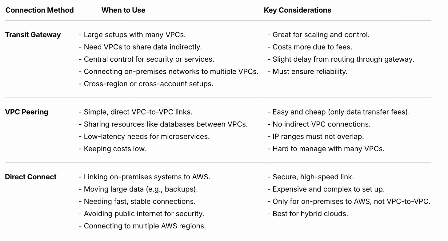 Comparing these solutions reveals their distinct purposes. Transit Gateway excels in managing complex, multi-VPC environments, creating a Hub-and-Spoke model that supports transitive routing and centralized control. Its scalability and integration with on-premises networks make it ideal for large enterprises, though it comes with higher costs and potential latency. VPC Peering is suited for simple, direct VPC-to-VPC communication, offering low latency and minimal cost but lacking transitive routing and scalability for large networks. Direct Connect is the go-to solution for secure, high-performance connectivity between on-premises infrastructure and AWS, particularly for hybrid cloud or data-intensive applications. Still, its cost and setup complexity limit its scope to specific use cases. While Transit Gateway’s Hub-and-Spoke model addresses the scalability limitations of VPC Peering, it introduces additional costs and latency compared to Peering’s direct connections. Conversely, Direct Connect’s focus on on-premises connectivity complements both Transit Gateway and VPC Peering, which are primarily cloud-centric.
